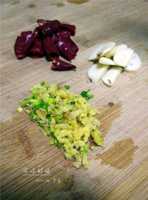 老姜、小葱分别切成碎粒;大蒜切片,干辣椒切段;