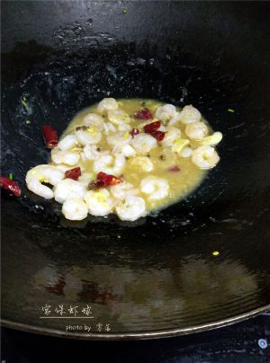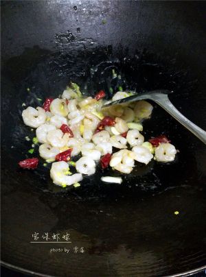 放入虾仁翻炒,断生后,放入葱姜蒜翻炒;