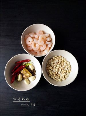 虾仁挑去虾线,洗净;花生用微波炉高火加热3分钟,稍凉后搓掉花生衣;再备些干辣椒、花椒、老姜、大蒜、小葱;