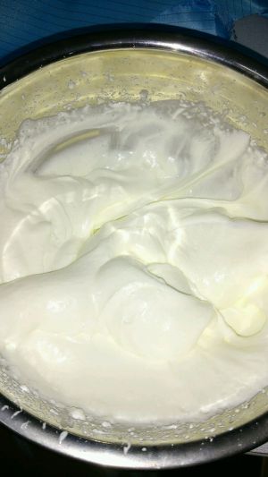 奶油要打成这样,我用的是雀巢淡奶油,底下加一盆冰水 然后这盆放下去冰一下 一边冰 一边打 不用5分钟就好了。