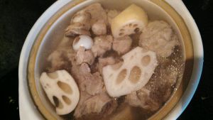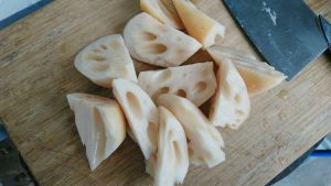 猪骨和莲藕放入砂锅,加入姜片,放足够量的水,大火烧开后转小火炖两个小时