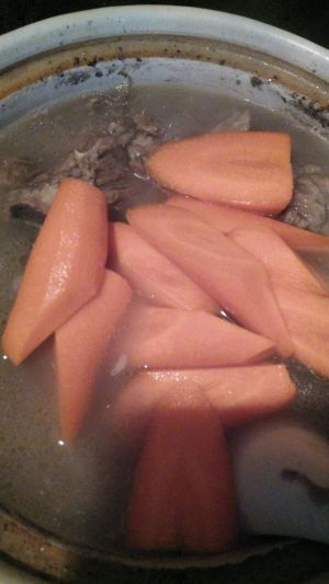 两个小时后放入胡萝卜,再小火炖一个小时,加入盐调味即可。(喝汤的话,清淡最好,盐不用放很多。)