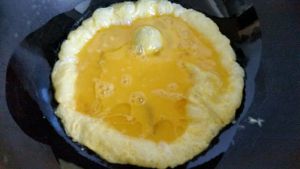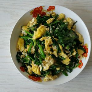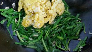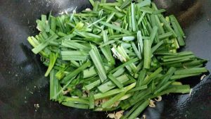 韭菜变色后放入鸡蛋加入盐,五香粉,翻炒出锅
