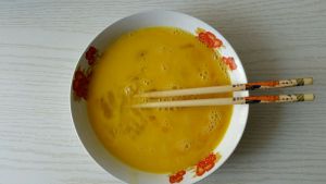 鸡蛋打入盘中,加少许水,少许料酒打散搅匀