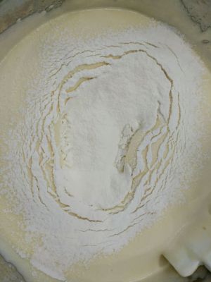 筋入低筋面粉,刮刀采用翻拌的方式拌均匀,至无干粉。