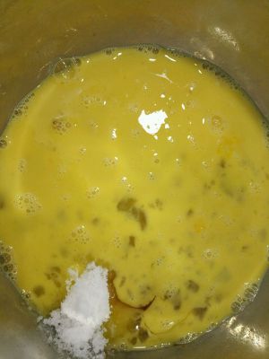 将鸡蛋打入盆中,打散后加入蜂蜜和绵白糖。