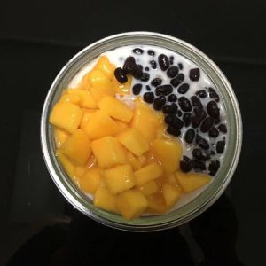 最后把牛奶蒸好后,放凉有一层薄皮,牛奶取出加入蛋清,再倒回牛奶中,然后上锅蒸15分钟,最后出锅,放上蜜豆和芒果