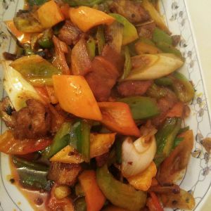 然后把肉推到一边,下青红椒和蒜苗,加盐,鸡精,老抽和生抽,炒至断生入味,再和肉一起翻炒。