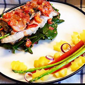将烤好的鱼放在菠菜上再浇上葡萄醋汁即可
