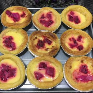 倒入搅拌好的蛋挞液,8分满,放入烤盘,烤箱220度提前预热10分钟放入蛋挞烤20分钟