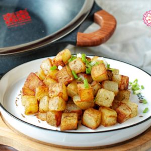 油热后把土豆丁放进锅里,一点点油就够了,完全不会粘,土豆粒勤翻动,别煎糊了。