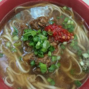 将红烧牛腩以及卤汁盖浇在面上,撒葱,新鲜剁椒