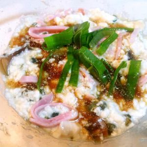 把皮蛋和豆腐火腿拌在一起,最后加入沙拉汁和葱花