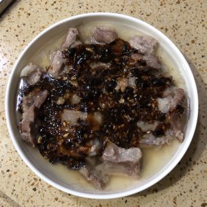 爆蒜,放豆豉,酱油,老抽,盐,鸡精,倒入生粉水勾芡收汁。