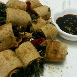 准备锅下油,油热后将豆皮卷下锅炸脆。捞起,摆盘,撒上籽然粉。吃的时候沾刚调配的酱汁。脆香诱人O(∩_∩)O