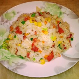 剩饭微波打一分钟,倒进炒至半熟的玉米和洋葱里,加盐、黄酒一起翻炒。