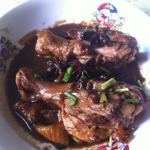 让鸭腿慢慢渗透酱味,然后放一碗水,烧至鸭腿熟