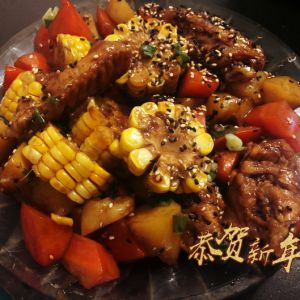 准备食材,玉米切段,胡萝卜和土豆切滚刀块
