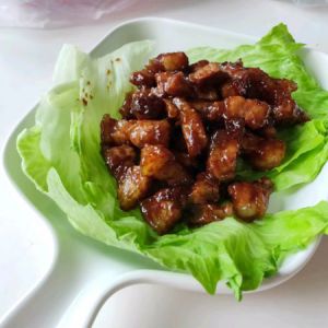 切成小手指这么粗的小块 加照烧汁腌制十分钟以上,口味重的再加点盐。另外加点红薯粉之类的一起腌肉会嫩一点 你喜欢加嫩肉粉也行