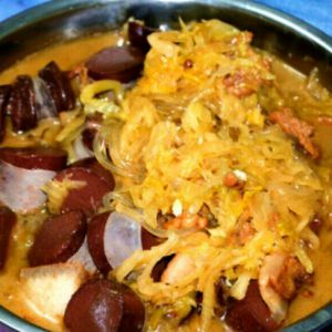 8酸菜八九成熟时加入盐和鸡精调味,放入血肠炖10分钟左右。