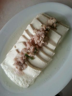 豆腐顺着刀切块,如果怕它切烂,切子前用淡盐水浸上半个小时就减少切烂。切好摆盘,将肉末摆在豆腐块上入锅蒸8一10分钟左右。