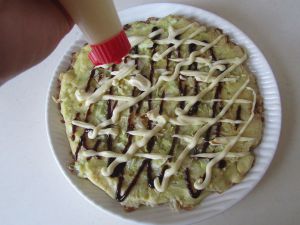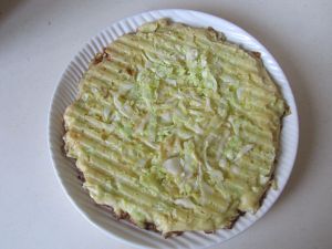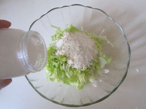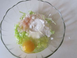 圆白菜切成丝, 加入面粉和鱿鱼丁;