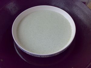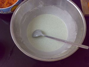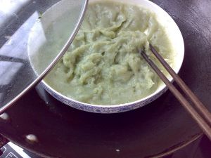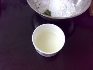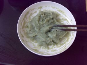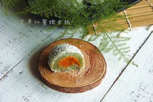 艾草粉、糯米粉、澄粉放一起,加进糖水拌成浆