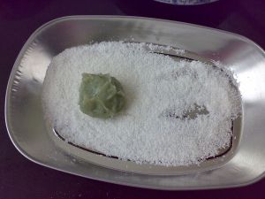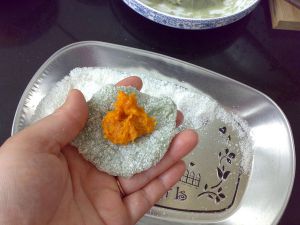 让粉团粘上椰蓉后按扁放适量的红薯泥
