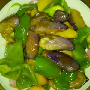 下炸好的土豆和茄子,加点蚝油和白糖翻炒一下装盘。