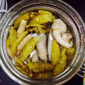 分别加入一勺盐、适量醋和料酒,以及泡椒、泡椒水、凉开水,直到鸡爪被完全淹没。