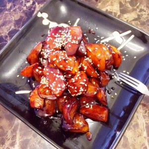 取芝麻撒在红薯上,迅速装盘,盘子上事先抹上油,以免粘盘。同时带上一碗凉水,涮筷子,蘸水。蘸水后,红薯块上的糖与糖葫芦相似,也降低了糖的温度,不烫嘴。