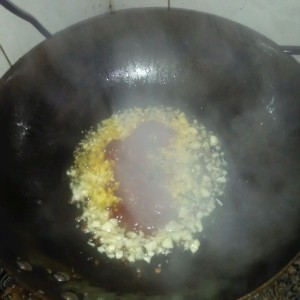 锅里放油,花椒麻椒炒香,捞出来。在放蒜姜沫,和郫县豆瓣酱炒一两分钟。