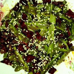 倒入刚才煸熟的四季豆,大火爆炒半分钟左右即可,关火。可加入一点生抽调味上色,最后上盘,洒上一些熟的白芝麻就可上桌喽!