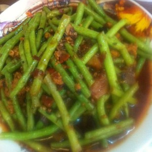倒入茄子,豇豆一起扁炒,迅速下入糖醋汁➕盐一起炒开大火。炒三分钟左右即可放入鸡精调味装盘。