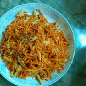锅里放油,烧热,下入瘦肉丝翻炒至断生,加入胡萝卜继续翻炒