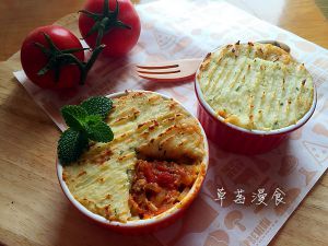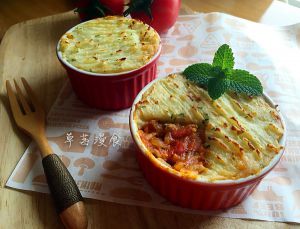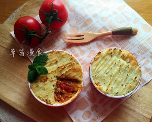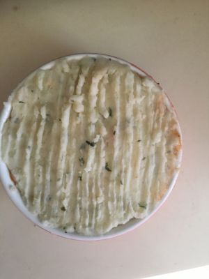 将土豆泥盖在肉酱上,表面用叉子涂均匀,可以用叉子划出纹路