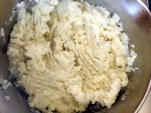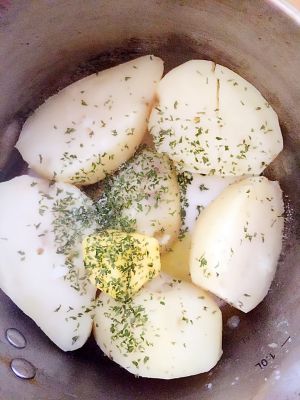 加入干欧芹碎,黄油,牛奶后压碎,再搅拌成泥!工具随意