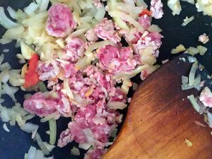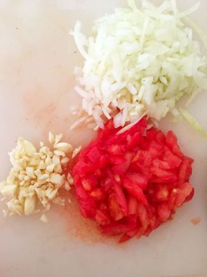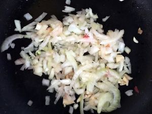 平底锅中加少许油,放入洋葱和大蒜一起炒香