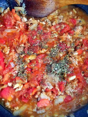 加入盐,黑胡椒,意大利混合香料翻炒均匀后,小火炖3分钟