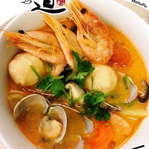 汤煮开后加入各种材料:大虾,蛤蜊,鱼丸,西红柿,土豆,胡萝卜,香菇,中火炖大约十五分钟左右,挤入青柠汁,我用的半个。将三分之一袋椰粉用开水化开后倒入锅中搅匀。再次煮开后撒上香菜可以开动啦!ps:用椰浆最好,不过我没有,就用了椰粉,一定提前用开水化开,直接倒锅里容易变小疙瘩块