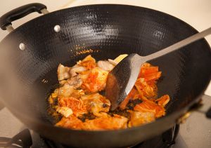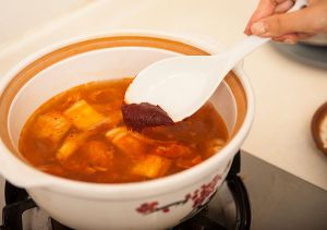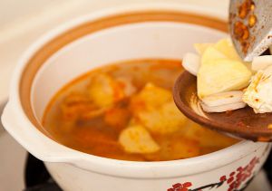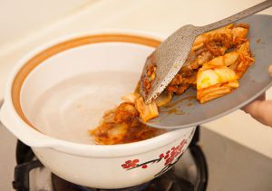 把翻炒过的食材放入已注水煮开的砂锅里