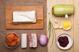 五花肉、土豆、西葫芦、年糕、辣白菜、蒜、豆腐、 洋葱、葱切好备用