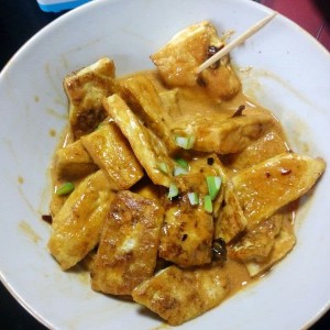 豆腐切小块,电饼铛里刷少量油,把豆腐放到电饼铛里煎,煎至两面金黄即可,