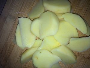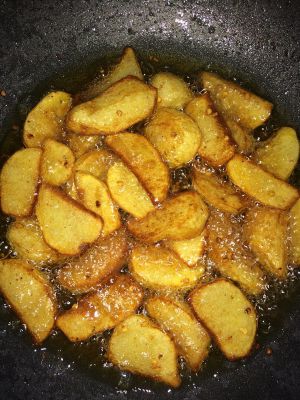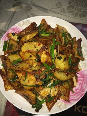 然后把锅里的油倒出、锅里余留少许、将辣椒面、盐、花椒面放到锅里翻炒两下、再把炸好的洋芋到下翻炒,好了之后放入葱、香菜、摘耳根、卤腐拌匀即可出锅了。