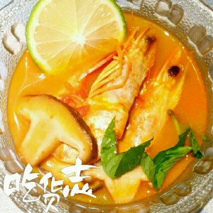 放入虾,小火后加入香菇等,滴柠檬汁适量