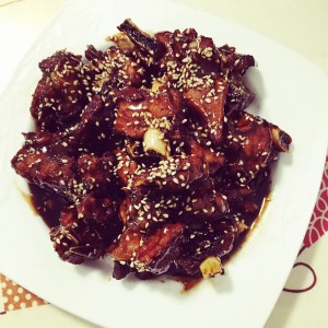 放姜末和排骨下锅,大料和花椒一同扔进去,放料酒和酱油、醋下锅翻炒几下,然后倒开水没过排骨即可,大火煮开转小火继续煮,中途尝酸甜度,然后依据个人口味适当添加糖和醋,排骨熟了之后大火收汁,装盘撒芝麻即可