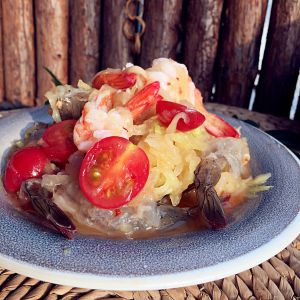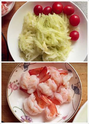 把青木瓜和煮熟的虾 小番茄 放在盘中备用