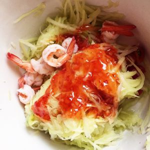 把甜辣酱和鱼露加入青芒果丝中 最后再加些柠檬汁 酸度可根据自己口味调节 加少许盐