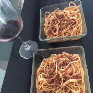放入番茄丁 煸炒 再放入煸炒的肉末 加入适量红酒 糖 盐 炒成糊状