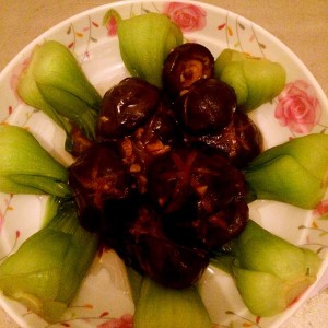 收汁,取出香菇,摆在油菜中间。完成。